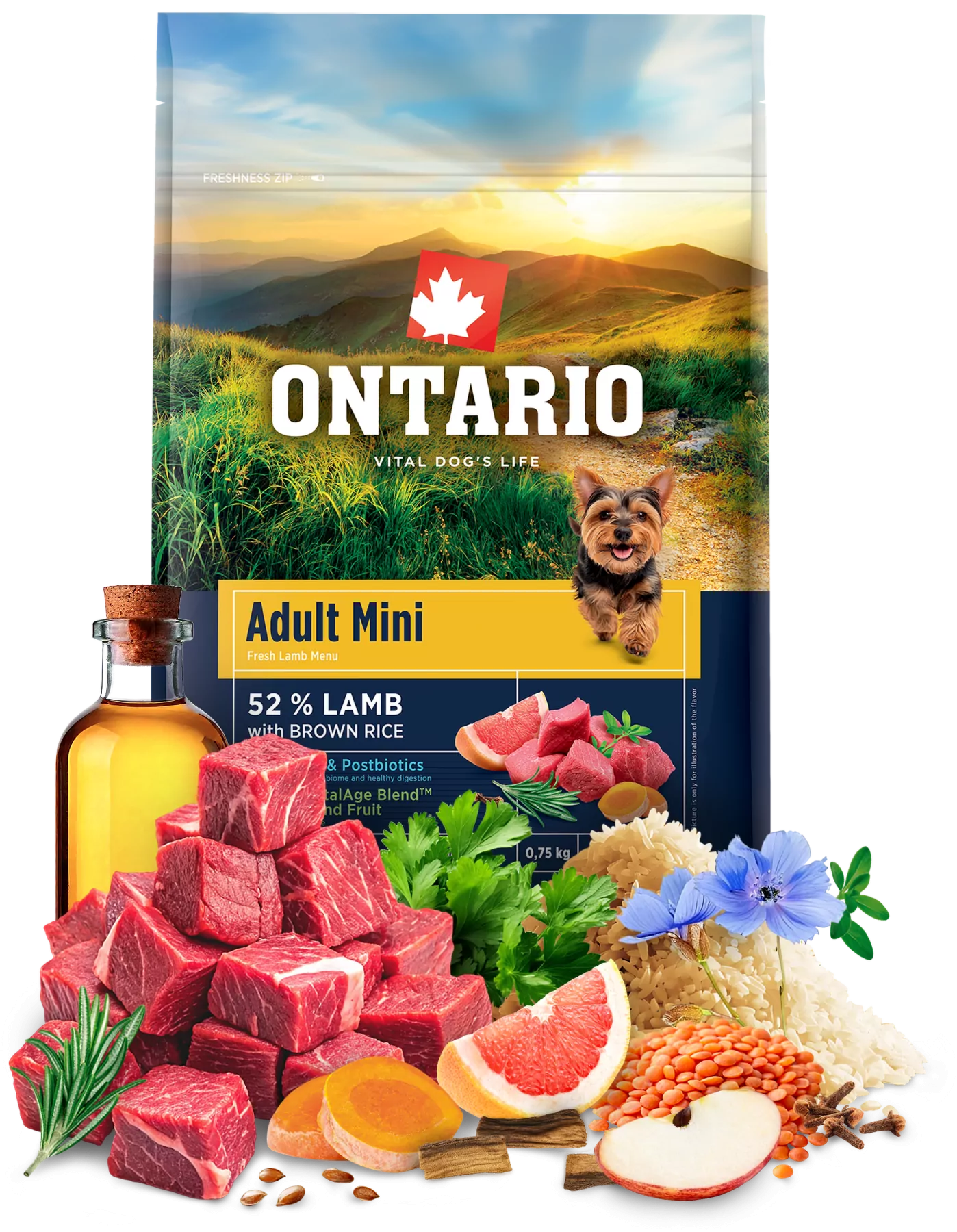 Složení: čerstvé jehněčí (26%), dehydrovaná jehněčí bílkovina (26%), hnědá rýže (23,5%), tuk z drůbeže (9%), hrachový protein (5%), červená čočka (3%), lněné semínko (3%), hydrolyzované kvasnice (2%), lososový olej (1%), sušené jablečné řízky (1%), minerální látky (0,4%), hrachová mouka (0,1%), mannan-oligosacharidy (0,015%), frukto-oligosacharidy (0,012%), Mojave yucca (0,01%), Lactobacillus helveticus HA – 122 inaktivovaný (15 x 10^9 buněk/kg), směs sušených bylin a rostlinných extraktů 0,035% (0,01% sušená petržel a tymián, 0,025% Ontario VitalAge BlendTM (rostlinné extrakty z grapefruitu, kurkumy, hřebíčku a rozmarýnu)). Analytické složky: hrubý protein 27%, hrubý tuk 17%, hrubý popel 7%, hrubá vláknina 2,8%, vápník 1,6%, fosfor 1,3%, sodík 0,2%, omega 6 mastné kyseliny 3,1%, omega 3 mastné kyseliny 0,2%, vlhkost 10%. Doplňkové látky: Nutriční doplňkové látky v 1 kg: vitamín A (3a672a) 18 000 m.j., vitamín D3 (3a671) 1 200 m.j., vitamín E (3a700) 500 mg, vitamin C (3a312) 250 mg, vitamin B1 (3a821) 4 mg, zinek (3b612) 86 mg, železo (3b107) 62 mg, mangan (3b505) 28 mg, jodid draselný (3b201) 1 mg, měď (3b407) 12 mg, selen (3b810) 0,13 mg, cholin chlorid (3a890) 1 800 mg, glukosamin sulfát 260 mg, chondroitin sulfát 180 mg. Technologické doplňkové látky: extrakty tokoferolů z rostlinného oleje (1b306(i)), askorbylpalmitát (1b304). m.j. = mezinárodní jednotky. Metabolizovatelná energie: 3 828 kcal/kg.